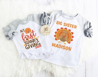 Customized Brother Sister Shirts Thanksgiving Turkey Matching Sibling Set - Big Sister T Shirt Little Sister Romper.